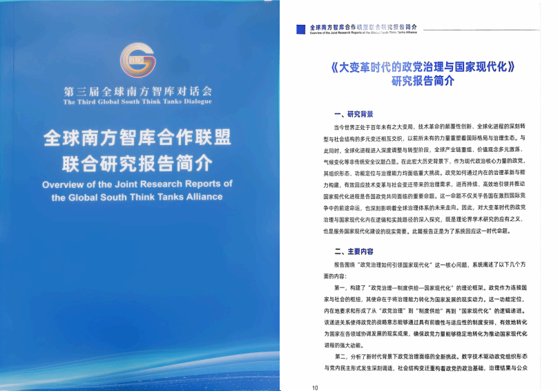 在上午开幕式大会上发布了2025年全球南方智库合作联盟五项联合研究成果,由上海大学政党治理与社会发展研究中心承担,高立伟教授牵头负责的《大变革时代的政党治理与国家现代化》研究报告位列其中。