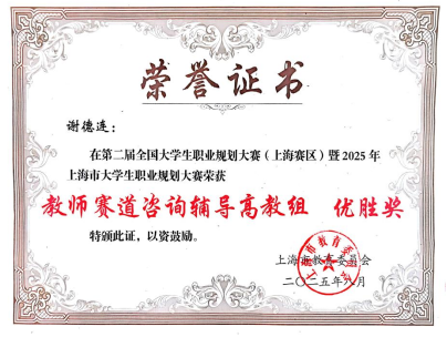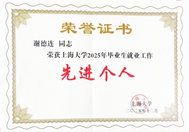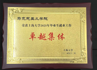 就业工作 1. 马克思主义学院获上海大学2025年毕业生就业工作“卓越集体” 2. 王国建获上海大学2025年毕业生就业工作“卓越领导” 3. 谢德连获上海大学2025年毕业生就业工作“先进个人” 4. 谢德连获第二届全国大学生职业规划大赛(上海赛区)暨2025年上海市大学生职业规划大赛教师赛道咨询辅导高教组“优胜奖”