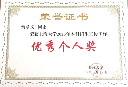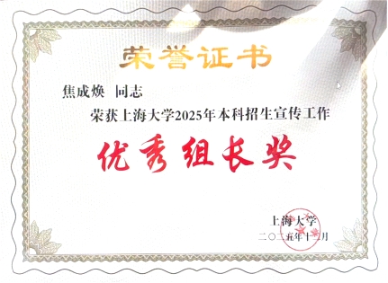 2025年12月11日下午,上海大学举行2025年本科招生与学生就业工作总结表彰会暨2026年工作推进会。我院2025年在学校招生宣传和就业工作中成绩斐然,荣获多项荣誉表彰。 招宣工作 1. 四川招生宣传组(马克思主义学院)获上海大学2025年本科生招生宣传工作“先进集体二等奖” 2. 王国建获上海大学2025年本科生招生宣传工作“卓越领导奖” 3. 焦成焕获上海大学2025年本科生招生宣传工作“优秀组长奖” 4. 杨章文获上海大学2024年本科生招生宣传工作“优秀个人奖”