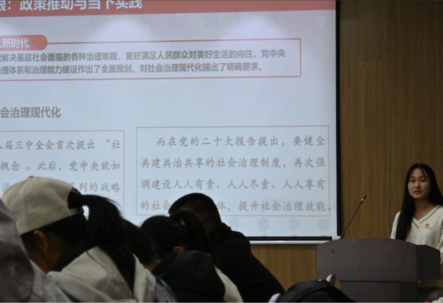 在“青春逐梦新程 勇立时代潮头”篇章,团员们共同观看央视新闻专题视频《每年五四前后的时间我留给青年人》,直观感受习近平总书记对青年一代的深情关怀与殷切嘱托,视频结束后的简短感悟交流环节,大家踊跃分享心声。随后,王晨栋同学带来“习近平总书记关于青年工作的重要思想”主题微团课,他系统宣讲了新时代青年成长的遵循与方向,激励大家共同筑牢思想根基、共赴理想使命。庞烨烨与张芸梓同学则携手,以《青春脚步丈量基层,先锋力量激活治理——基层治理中的青年实践》为微演讲主题,生动展现了青年学子将理论融入实践、用青春服务基层的责任担当。