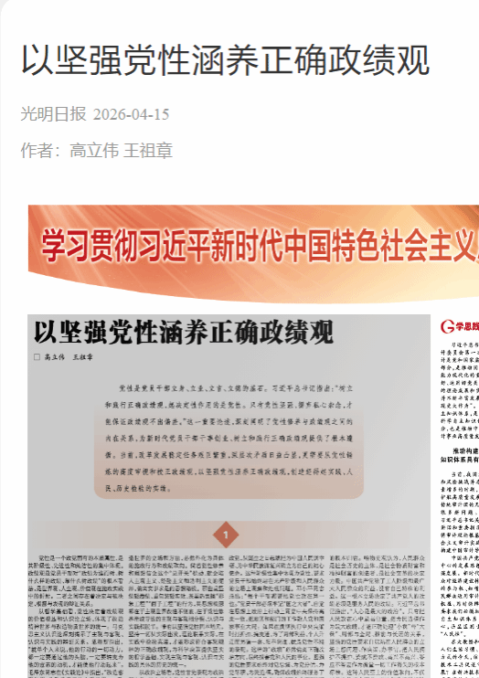 光明日报|高立伟,王祖章:以坚强党性涵养正确政绩观 以坚强党性涵养正确政绩观 高立伟 王祖章 党性是党员干部立身、立业、立言、立德的基石。习近平总书记指出:“树立和践行正确政绩观,起决定性作用的是党性。只有党性坚强、摒弃私心杂念,才能保证政绩观不出偏差。”这一重要论述,深刻阐明了党性修养与政绩观之间的内在关系,为新时代党员干部干事创业、树立和践行正确政绩观提供了根本遵循。当前,改革发展稳定任务艰巨繁重,深层次矛盾日益凸显,更需要从党性锤炼的高度审视和校正政绩观,以坚强党性涵养正确政绩观,创造经得起实践、人民、历史检验的实绩。 1 党性是一个政党固有的本质属性,是其阶级性、先进性和纯洁性的集中体现。政绩观是党员干部对“政绩为谁而树、树什么样的政绩、靠什么树政绩”的根本看法,是世界观、人生观、价值观在施政实践中的折射。二者之间存在着决定与被决定、根源与表现的辩证关系。 从哲学基础看,党性决定着政绩观的价值根基和认识论立场,体现了改造精神世界与改造物质世界的统一。马克思主义认识论深刻揭示了主观与客观、认识与实践的辩证关系。恩格斯指出,“就单个人来说,他的行动的一切动力,都一定要通过他的头脑,一定要转变为他的意志的动机,才能使他行动起来”。毛泽东同志在《实践论》中指出,“改造客观世界,也改造自己的主观世界——改造自己的认识能力,改造主观世界同客观世界的关系”。党性作为内化于心的政治品格,决定着党员干部认识世界、改造世界的立场和方法,必然外化为具体的施政行为和政绩取向。倘若党性修养和理想信念这个“总开关”松动,就会陷入主观主义、经验主义和功利主义的泥淖,偏离实事求是的思想路线。那些重显绩轻潜绩、重包装轻实效,甚至热衷搞“形象工程”“面子工程”的行为,其思想根源都在于主观世界改造不彻底,在于党性修养滑坡导致的主观与客观相分裂、认识与实践相脱节。唯有以坚强党性固本培元,坚持一切从实际出发,理论联系实际,在实践中检验真理,才能形成符合客观规律的正确政绩观,为科学决策提供坚实的哲学基础,实现主观与客观、认识与实践的具体的历史的统一。 从政治立场看,党性首先表现为政治坚定性,核心是“立党为公”,规定了政绩观的根本方向。马克思主义认为,政党是特定阶级利益的代表,阶级性是政党的本质属性。中国共产党作为马克思主义执政党,从诞生之日起就把为中国人民谋幸福、为中华民族谋复兴确立为自己的初心使命。这种阶级性集中体现为党性,要求党员干部始终站在无产阶级和人民群众的立场上观察和处理问题。邓小平同志指出:“每个干部都要把党性放在第一位。”党员干部必须牢记“国之大者”,自觉在思想上政治上行动上同党中央保持高度一致,把地区和部门的工作融入党和国家事业大局。如果在贯彻执行中央决策时打折扣、搞变通,为了局部利益、个人升迁而另搞一套、阳奉阴违,就是党性不纯的表现。这样的“政绩”必然偏离正确政治方向,最终损害党和人民的事业。坚强的党性要求始终对党忠诚、为党分忧、为党尽职、为民造福,确保政绩始终服务于“五位一体”总体布局和“四个全面”战略布局。 从价值取向看,坚持党性就是坚持人民性,体现为“为民造福”,指明了政绩观的根本归宿。唯物史观认为,人民群众是社会历史的主体,是社会物质财富和精神财富的创造者,是社会变革的决定力量。中国共产党除了工人阶级和最广大人民群众的利益,没有自己特殊的利益。这一根本立场决定了共产党人的政绩必须是服务人民的政绩。习近平总书记指出,“人心是最大的政治”。只有把人民放在心中最高位置,把为民造福作为最大政绩,才能正确处理“小我”与“大我”、局部与全局、眼前与长远的关系。坚强的党性要求自觉站在人民群众的立场上想问题、作决策、办事情,把人民拥护不拥护、赞成不赞成、高兴不高兴、答应不答应作为衡量一切工作得失的根本标准。这种人民至上的价值取向,不仅是党性的根本要求,更是创造经得起检验的实绩的价值基石。脱离人民群众的“政绩”,无论多么光鲜亮丽,最终都会在历史的检验中黯然失色。 2 唯物史观认为,改造客观世界与改造主观世界是辩证统一的过程。筑牢以坚强党性为基础的正确政绩观,需要在筑牢思想根基、校准价值坐标、提升决策水平等方面持续用力,为树立和践行正确政绩观奠定坚实根基。 在深化理论武装中筑牢政治忠诚。理论上清醒是政治上坚定的前提,也是政绩观正确的思想根基。政治忠诚是对党的性质宗旨的深刻认同和对党的路线方针政策的自觉践行。要坚持不懈用习近平新时代中国特色社会主义思想凝心铸魂、淬炼党性、锻造忠诚,深刻领悟其中蕴含的崇高政治信念、深厚人民情怀、强烈历史担当和求真务实作风,在深化理论武装中树牢政治忠诚的政绩观。正确的政绩观,是党性修养的集中体现,是对党忠诚的具体诠释。只有以坚强的党性为基石,深刻认识“我是谁、为了谁、依靠谁”这一根本问题,才能从思想深处解决好树牢正确政绩观的前提问题,才能筑牢信仰之基、补足精神之钙、把稳思想之舵。要深刻领会“立党为公、为民造福、科学决策、真抓实干”总要求,把“立党为公